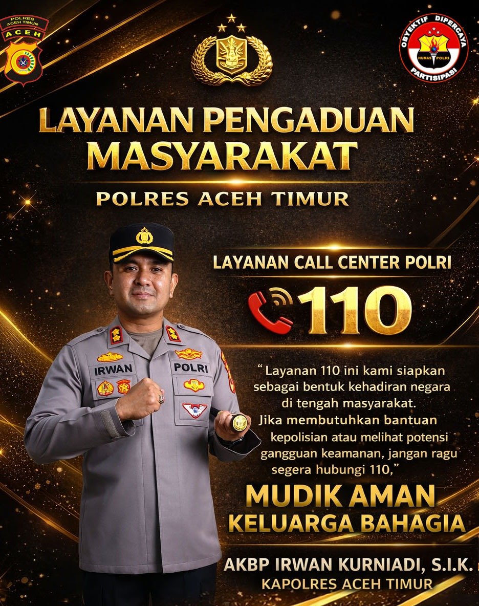Polres Aceh Timur, Polda Aceh mengajak masyarakat untuk memanfaatkan layanan hotline Polri 110 sebagai saluran cepat pelaporan dan permintaan bantuan kepolisian, khususnya selama Ramadhan 1447 Hijriah hingga momentum Lebaran 2026.