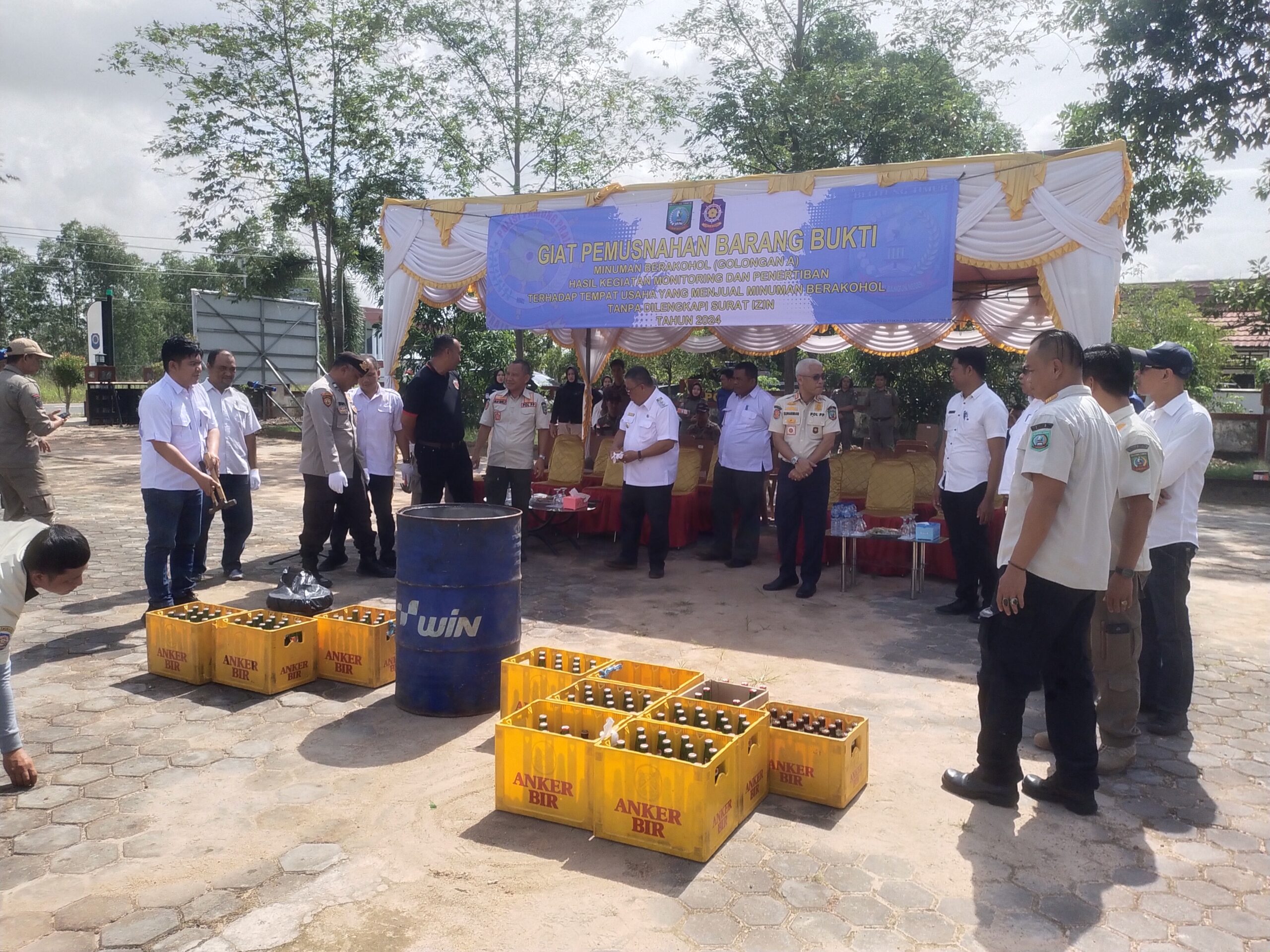 Wakil Bupati Belitung Timur, Khairil memimpin pemusnahan minuman beralkohol dan barang hasil pengawasan Pol PP Belitung Timur hari ini, Rabu, (23/05/2024)) di halaman kantor Pol.,PP.