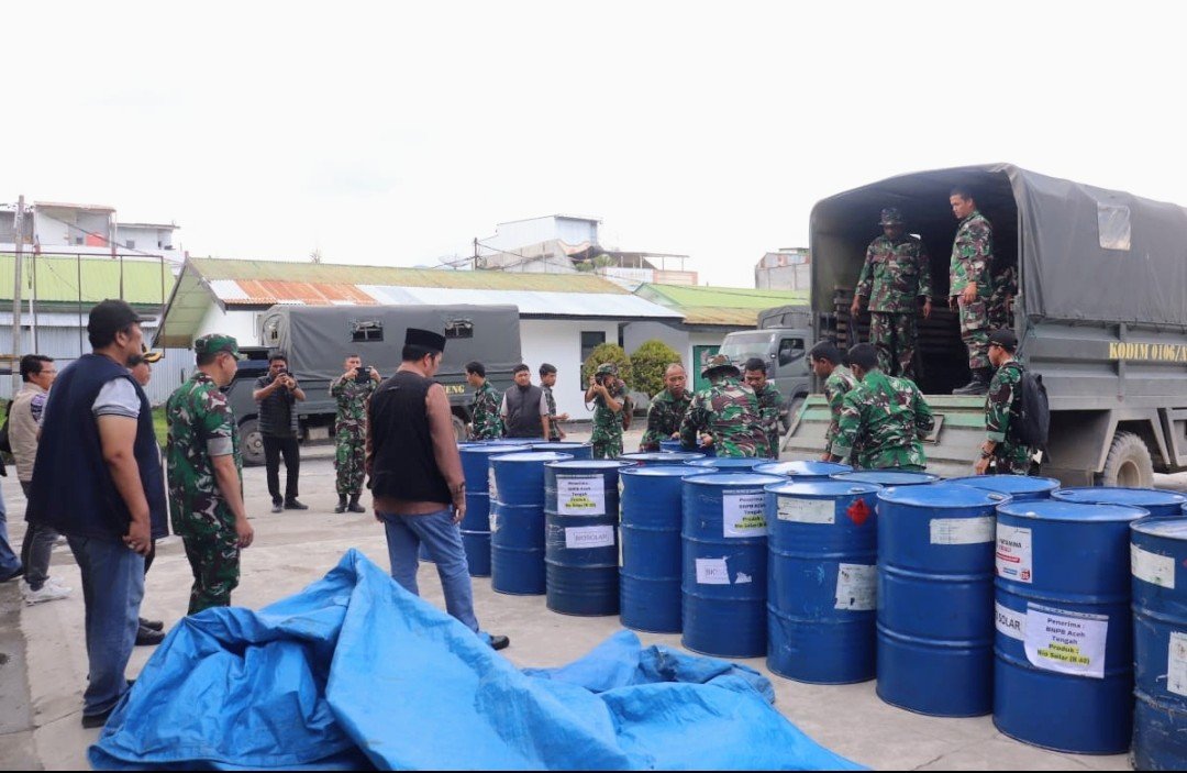 Dandim 0106/Aceh Tengah Letkol Inf Raden Herman Sasmita bersama Forkopimda Aceh Tengah menerima bantuan logistik Solar sebanyak 20 Drom bertempat di Makodim kpg bale atu kec, lut tawar Kab, Aceh Tengah.