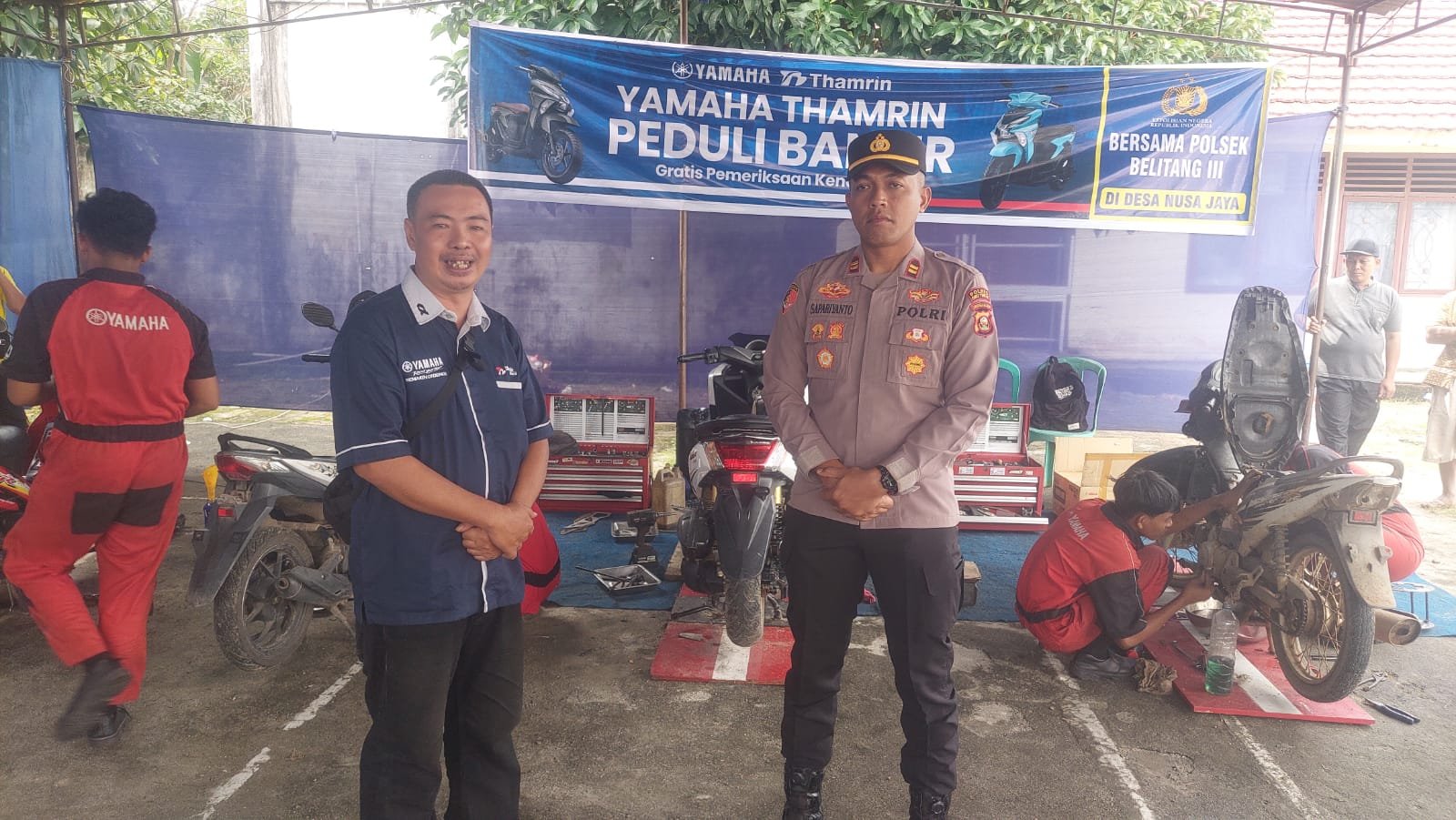 Kegiatan bakti sosial yang diadakan oleh polsek Belitang III bekerjasama dengan Deler Yamaha Thamrin Brothers melaksanakan servis gratis kendaraan warga masyarakat yang terkena musibah bencana banjir yang terjadi di Desa Nusa Jaya, kecamatan Belitang III, kabupaten Oku Timur, kegiatan bakti sosial servis gratis tersebut di gelar di Balai Desa setempat, Sabtu (10/01/2026), di mulai sekira pukul, 10.00 wib.