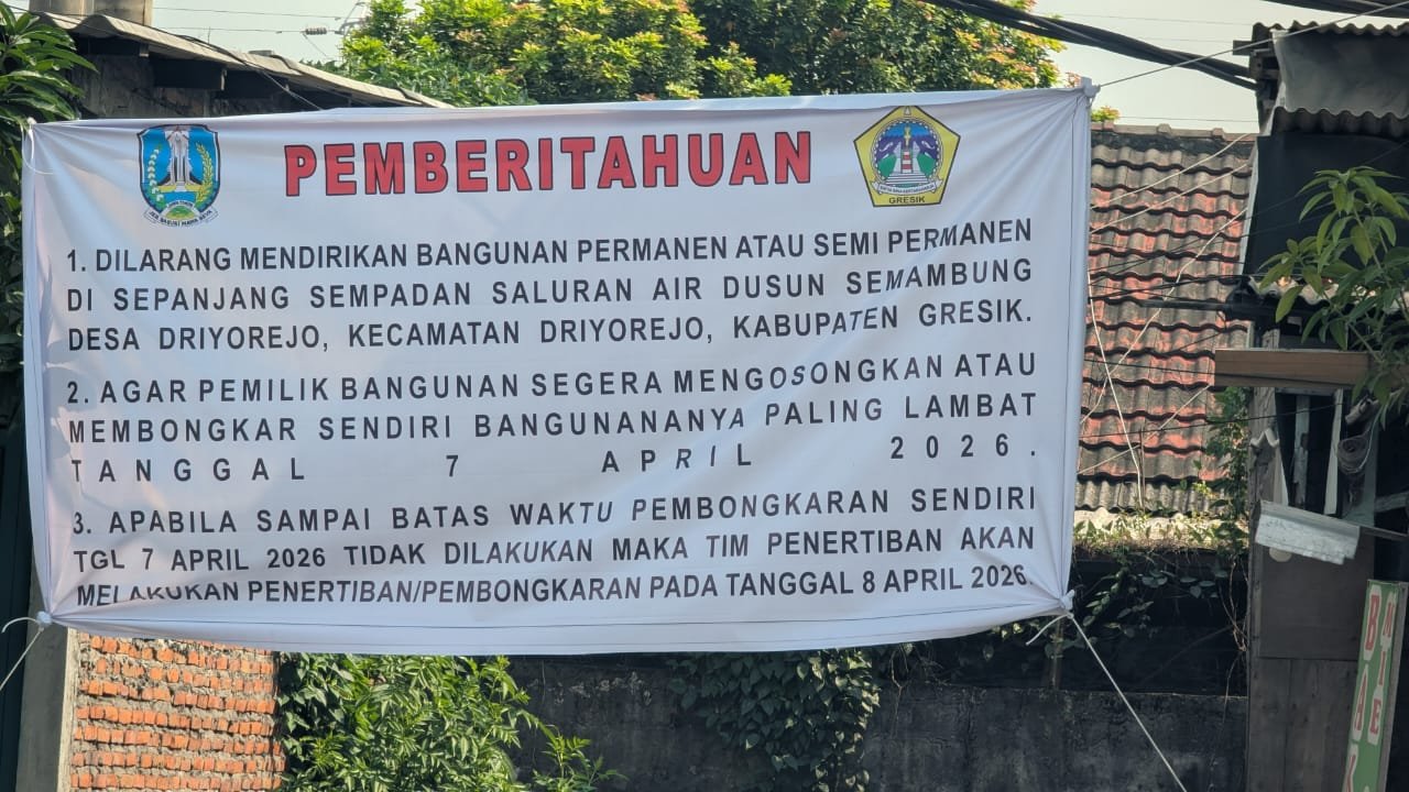 Gresik – Penertiban pedagang kaki lima (PKL) di Dusun Semambung, Kecamatan Driyorejo, Kabupaten Gresik, kembali mengemuka. Setelah sempat tertunda, banner pemberitahuan pembongkaran kini kembali terpasang dengan jadwal yang tegas.
