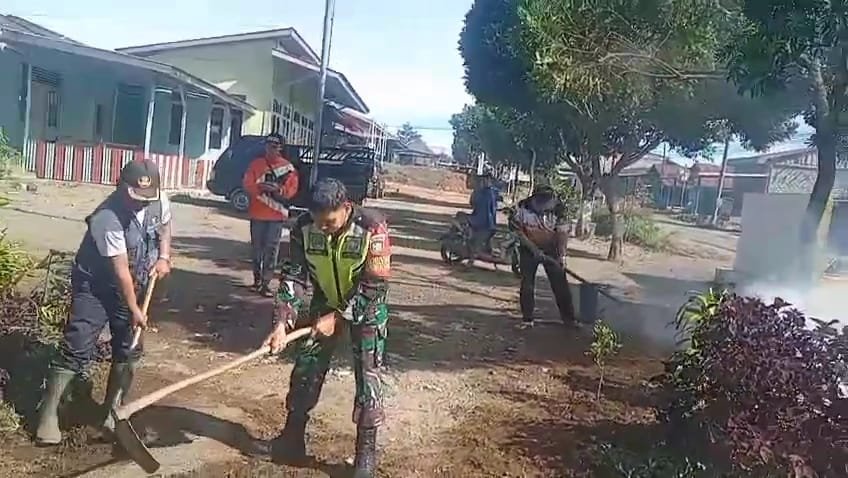 Babinsa Koramil 07/Atu Lintang, Serka Syuitno Syarifudin Lemba bersama warga melaksanakan kegiatan gotong royong membersihkan halaman Kantor Reje di Desa Pantan Damar, Kecamatan Atu Lintang, Kabupaten Aceh Tengah, Kamis (12/03/2026).