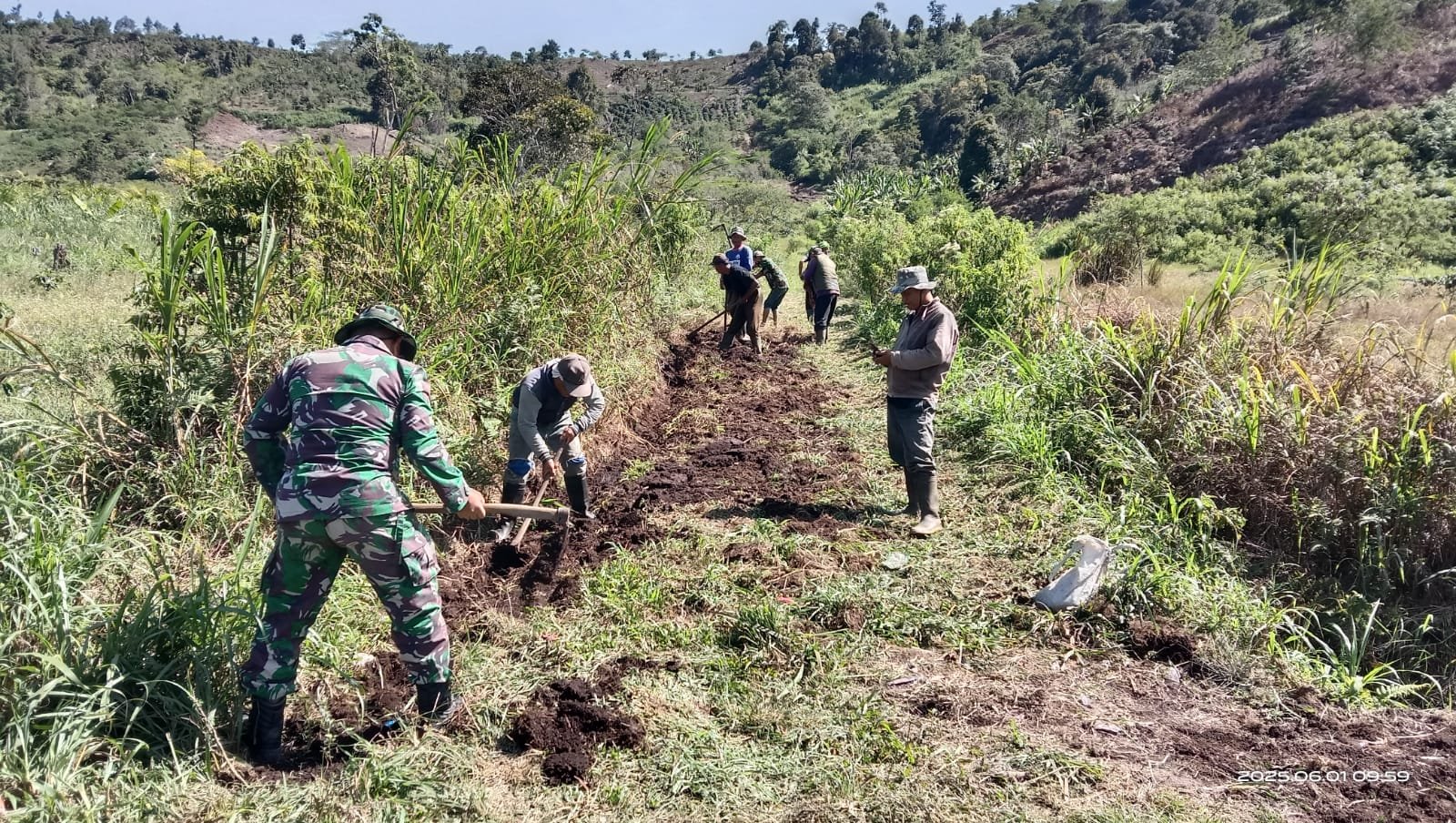Babinsa Koramil 06/Jagong, Sertu Suhardi, bersama warga Desa Berawang Dewal, Kecamatan Jagong Jeget, Kabupaten Aceh Tengah, melaksanakan karya bakti berupa perbaikan jalan perkebunan pada Kamis (12/6/2025).