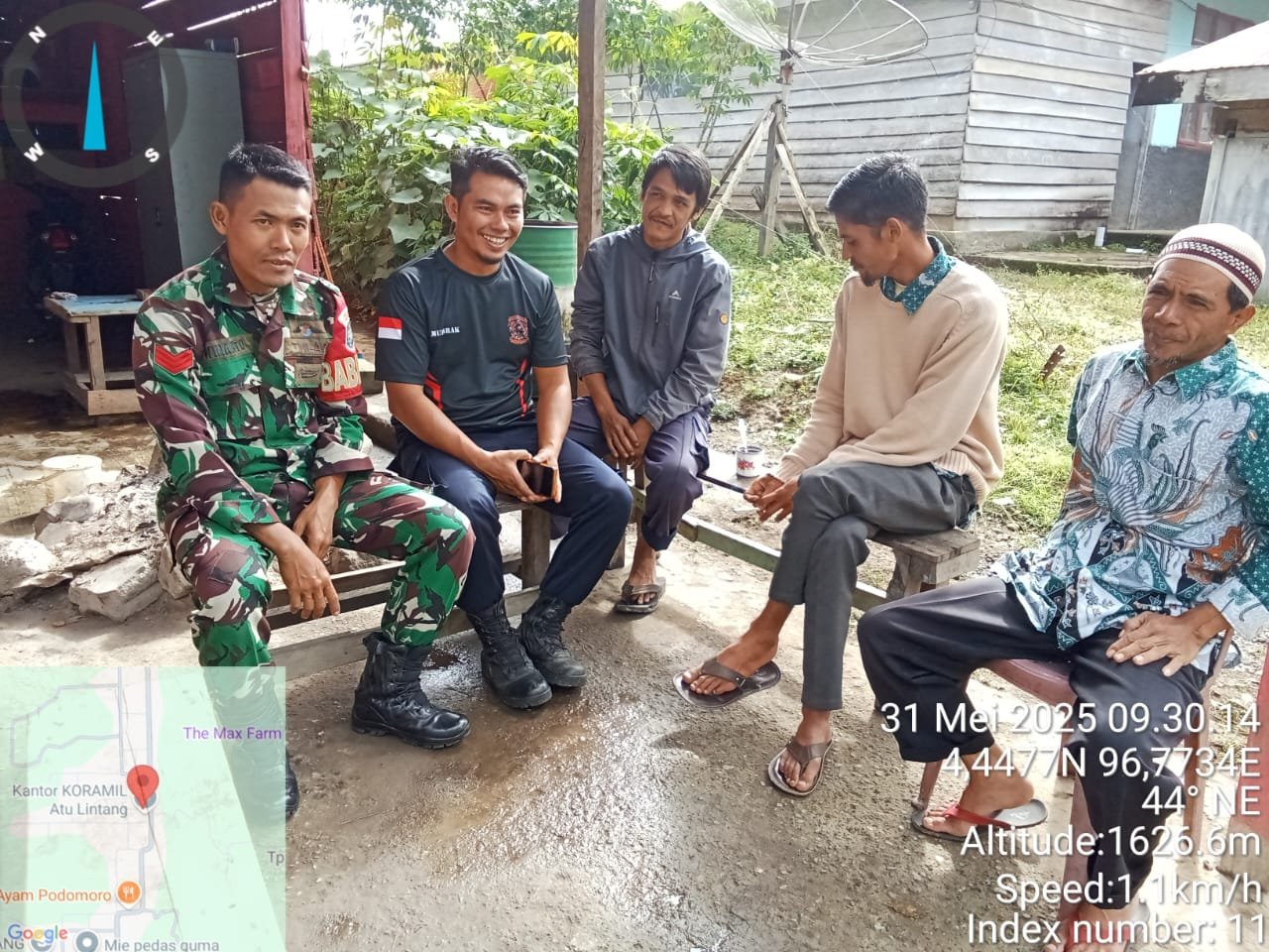Babinsa Koramil 07/Atu Lintang, Komando Distrik Militer (Kodim) 0106/Aceh Tengah, Kopral Kepala (Kopka) Winarto, menggelar kegiatan komunikasi sosial (komsos) bersama warga di Desa Damar Mulyo, Kecamatan Atu Lintang, Kabupaten Aceh Tengah, pada Sabtu (31/5/2025).