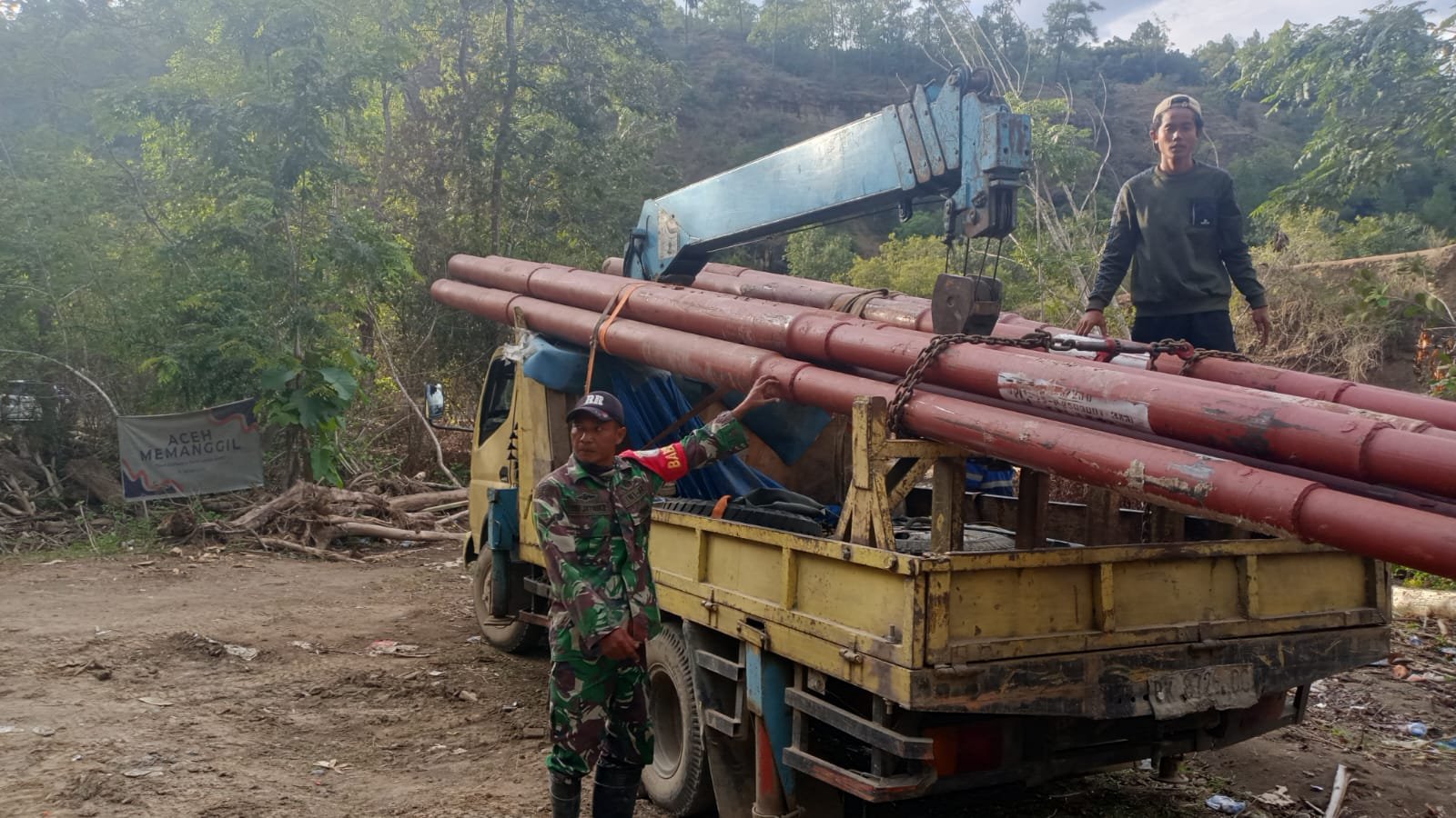 Anggota Koramil 05/Linge, Serda Trijatmiko, membantu proses mobilisasi tiang listrik di wilayah Sungai Kalaili, Desa Linge, Kecamatan Linge, Kabupaten Aceh Tengah, pada Jumat, 6 Februari 2026.