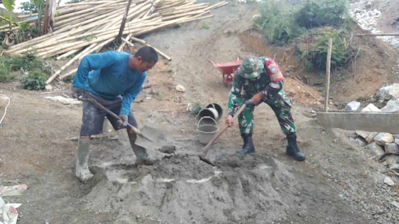 Dalam karya bakti itu, Sertu Suhardi terjun langsung membantu warga mengangkat bahan material, menggali tanah, hingga menata batu pondasi. Kehadiran Babinsa tidak hanya memberi tenaga tambahan, tetapi juga menumbuhkan semangat gotong royong di kalangan masyarakat desa binaan.