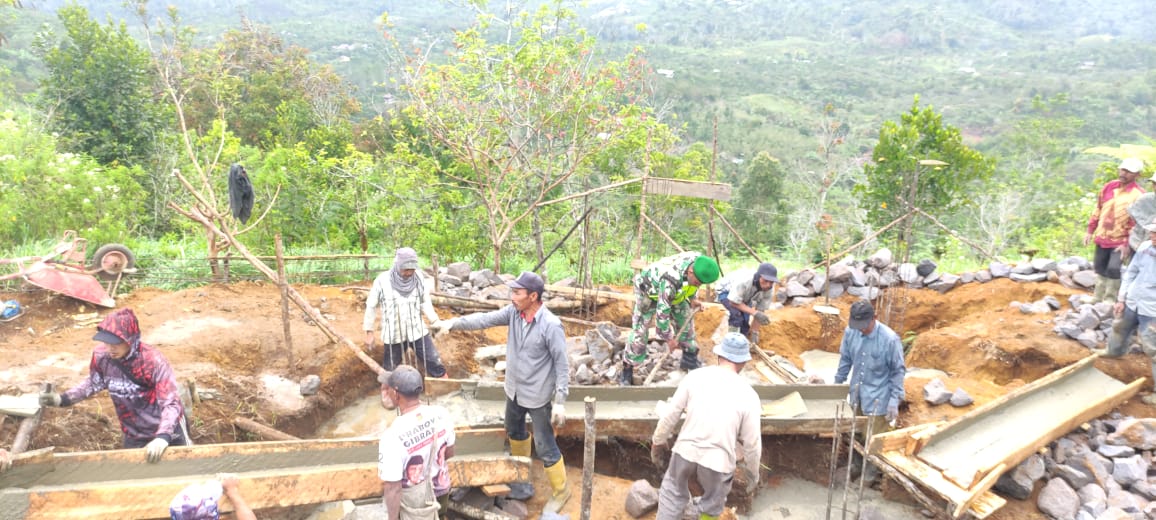 Babinsa Koramil 07/Atu Lintang, Sertu Raswan Juandi, melaksanakan karya bakti membantu warga dalam pengecoran pondasi rumah di Desa Kepala Akal, Kecamatan Atu Lintang, Kabupaten Aceh Tengah, Minggu (4/10/2025).
