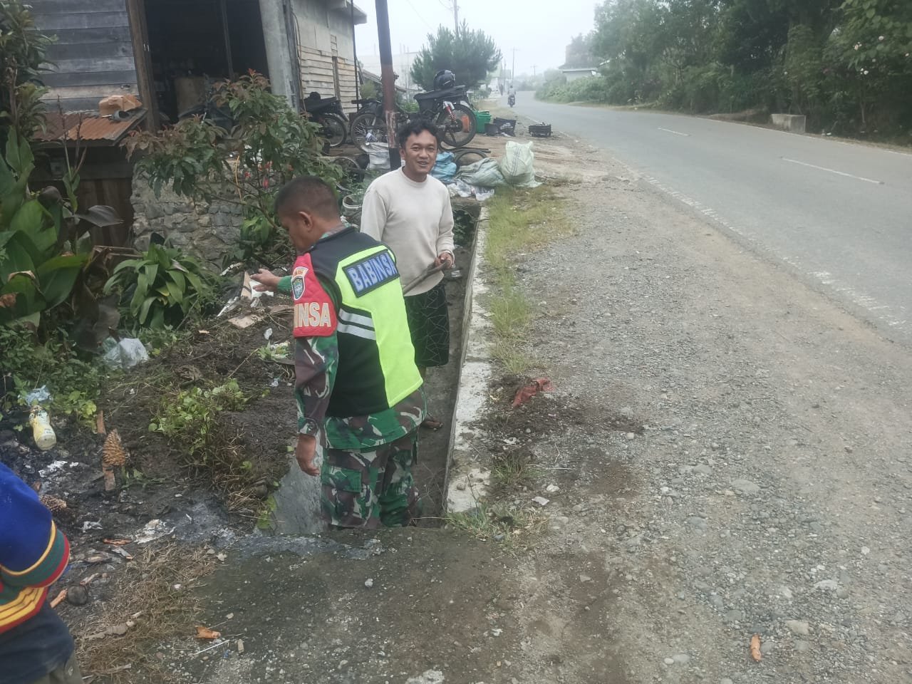 Babinsa Koramil 07/Atu Lintang, Kodim 0106/Aceh Tengah, Serda Zikran Sahadat bersama warga melaksanakan kegiatan gotong royong pembersihan saluran air atau parit di Desa Merah Mege, Kecamatan Atu Lintang, Kabupaten Aceh Tengah, Minggu (11/1/2026).