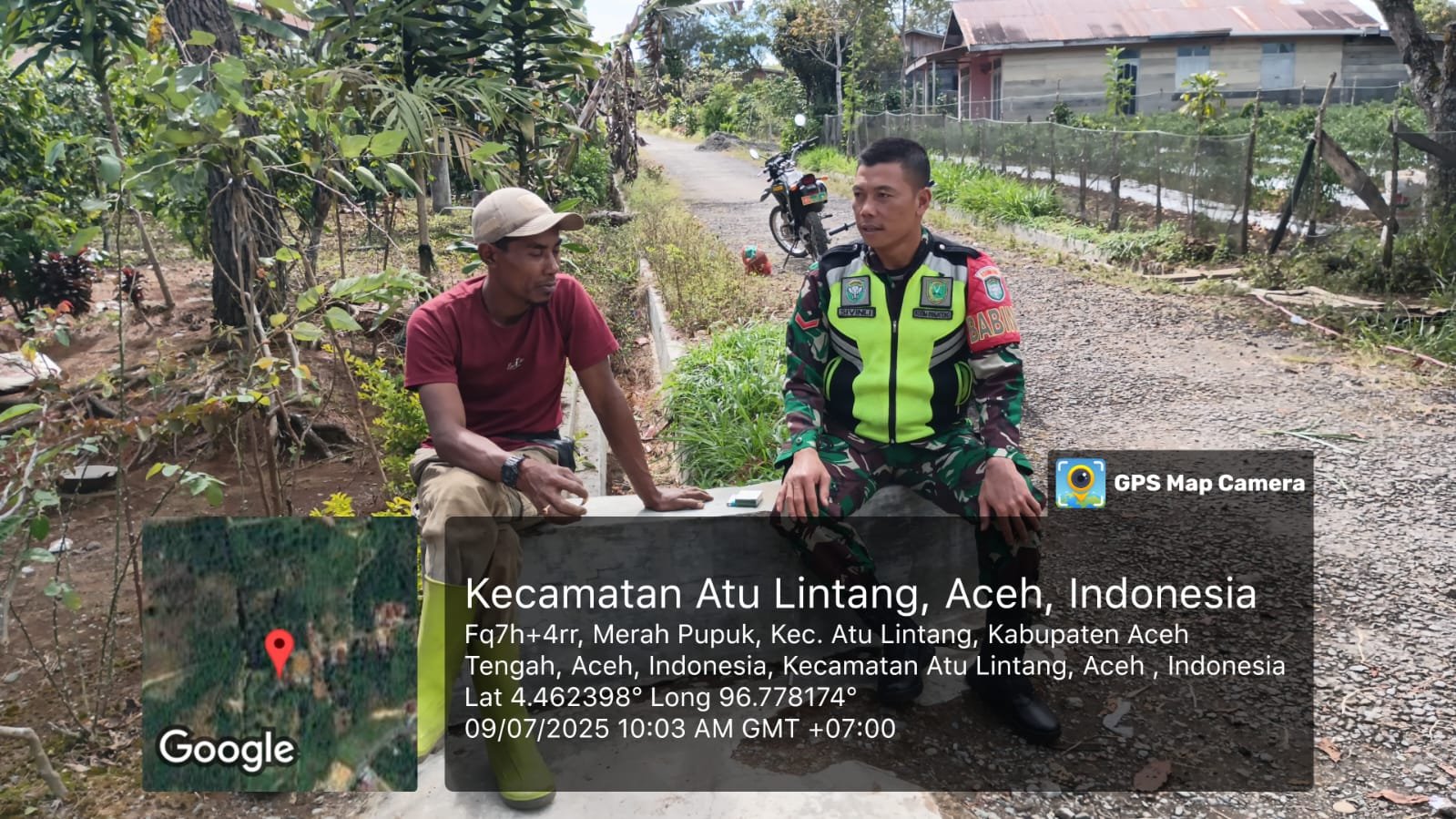 Babinsa Koramil 07/Atu Lintang, Kopda Sivinli, melaksanakan kegiatan Komunikasi Sosial (Komsos) bersama warga binaannya di Desa Merah Pupuk, Kecamatan Atu Lintang, Kabupaten Aceh Tengah, pada Rabu (9/7/2025). Kegiatan tersebut dilakukan sebagai bentuk pendekatan kepada masyarakat dan mempererat hubungan antara TNI dan warga desa.