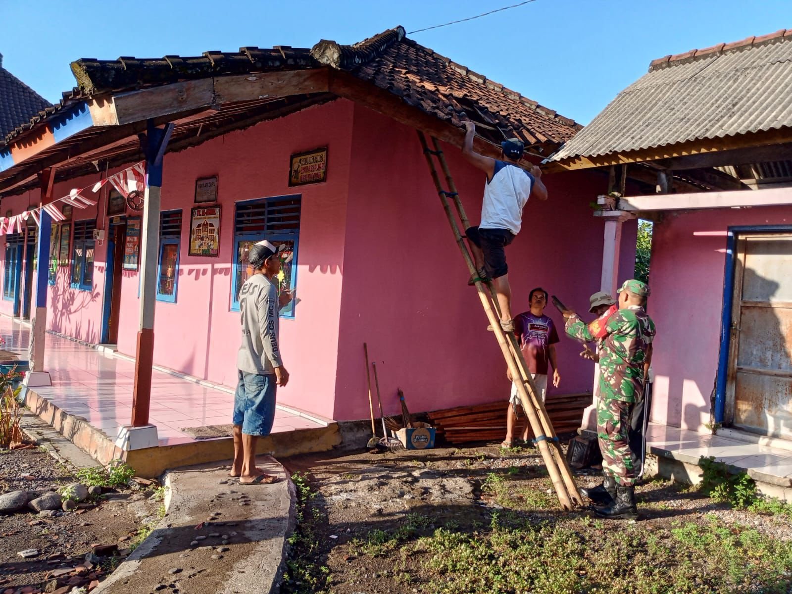 Babinsa Medewi, Laksanakan Gotong Royong Perbaikan Atap Gedung Sekolah TK AL AKMAL