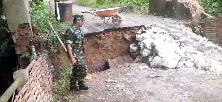 Bangkalan |Jatim | Babinsa Koramil 089-06/tanah merah melaksanakan monitoring wilayah dan menerima laporan atas adanya jembatan yang roboh pasca hujan di desa dlambah dajah, kec. Tanahmerah, kab. Bangkalan. pada Kamis (30/1/25).