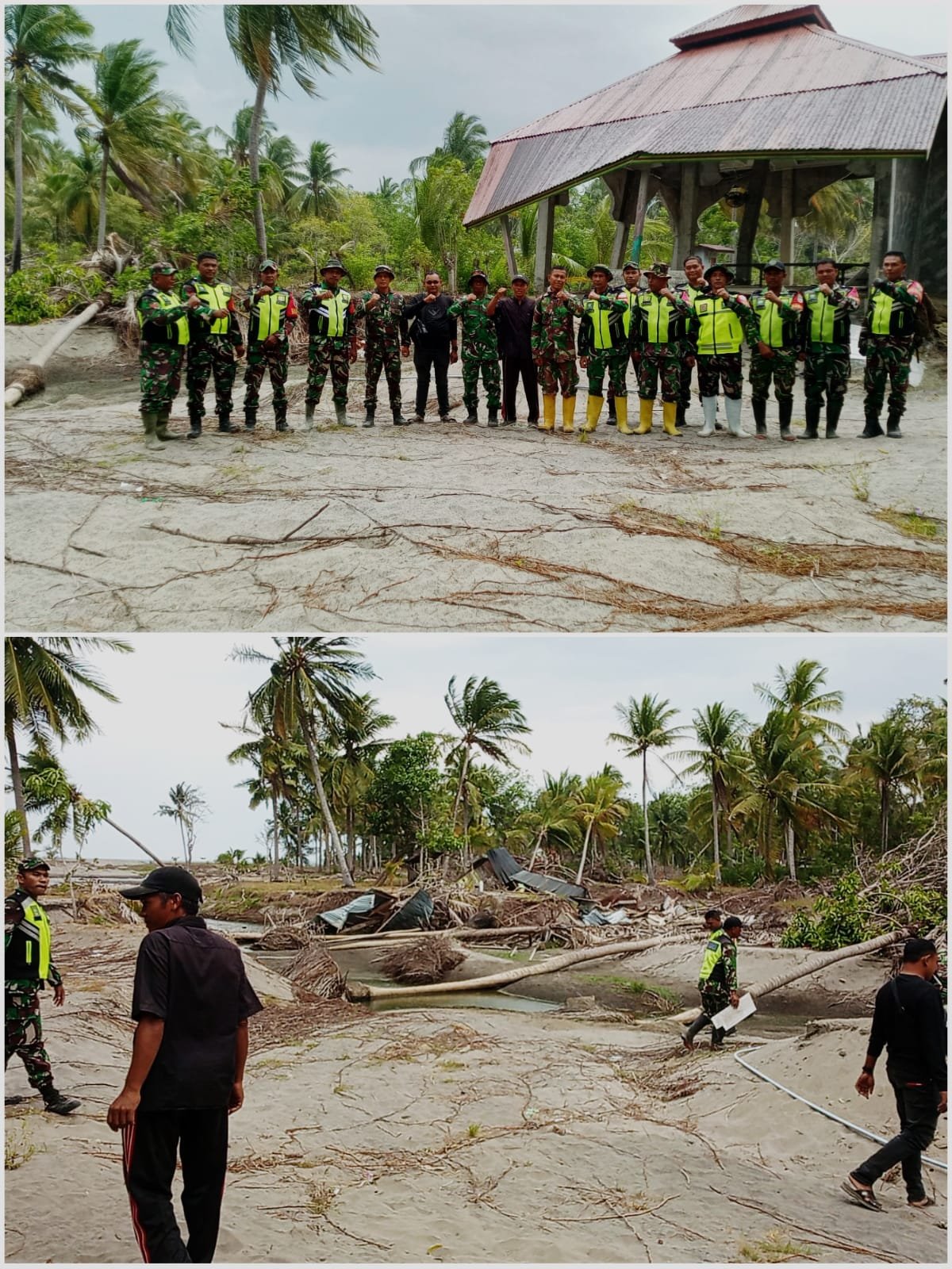 Sekitar ±25 personel Babinsa turun langsung ke lapangan untuk membersihkan puing-puing dan material dari bangunan yang rusak, termasuk meunasah, jalan desa, dan rumah warga yang sebagian besar masih memerlukan perbaikan bahkan harus dibangun ulang.