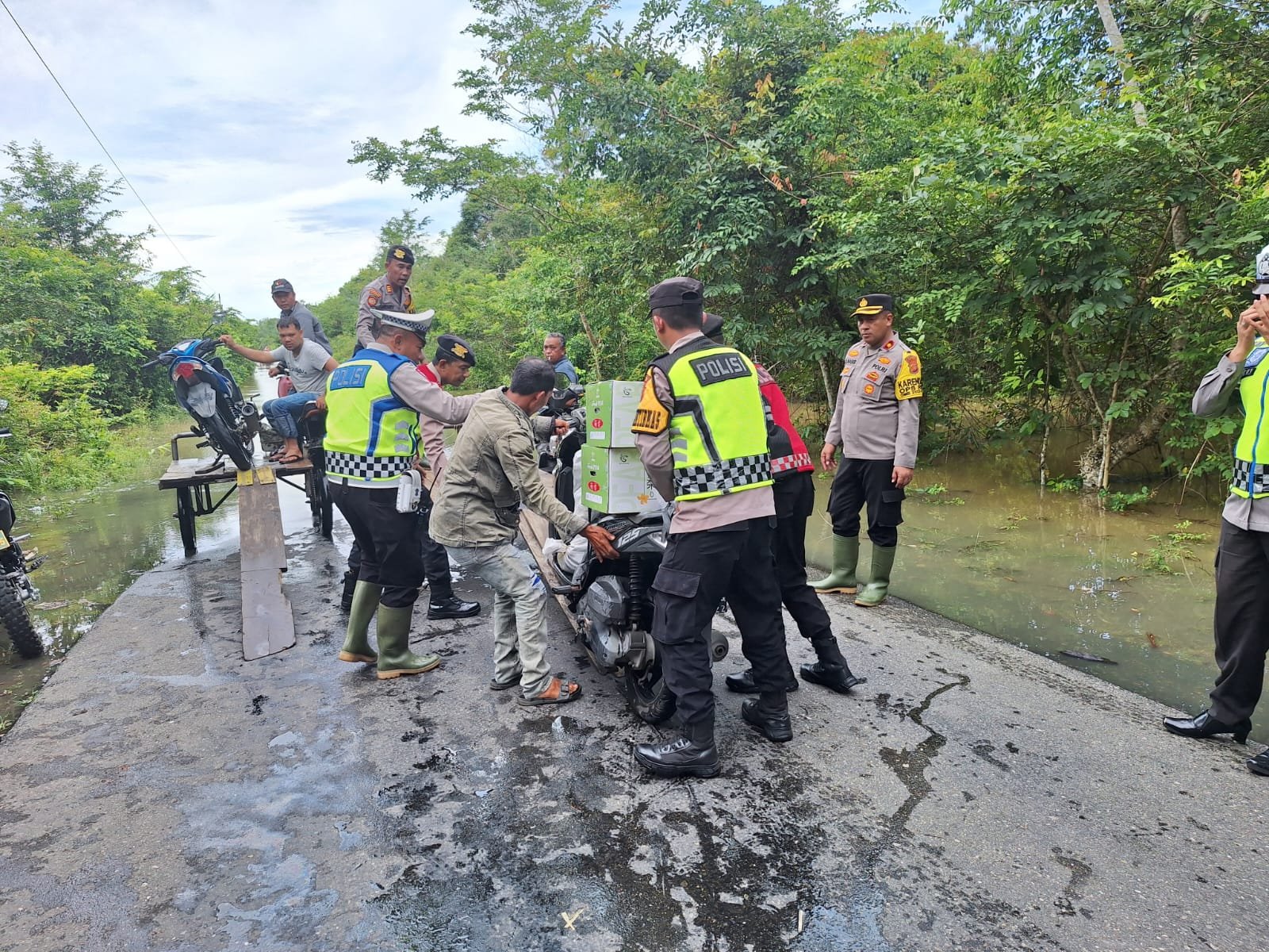 Maka dari itu personel Kepolisian dari Polsek Bubon yang dibantu oleh Personel Polres Aceh Barat di bawah pimpinan Kabag Ops Polres Aceh Barat Kompol M. Nasir S.H., M.S.M, ikut membantu warga melintasi banjir tersebut.
