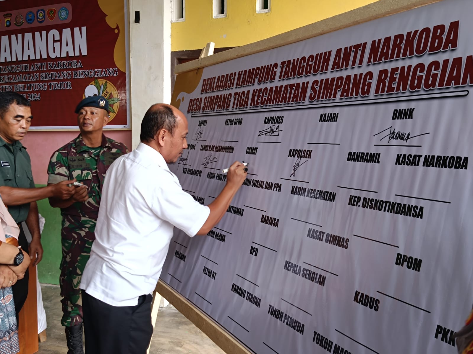 Hadir dalam pencanangan itu, Kapolres Beltim AKBP Indra Feri Dalimunthe, Camat Simpang Renggiang Adi Yusman, Kepala BNN Belitung Kompol Agus Handoko, Koramil Manggar, perwakilan dari TNI AU, perwakilan perusahaan, BPOM, tokoh masyarakat, tokoh agama, tokoh adat, tokoh pemuda, forum anak desa simpang tiga, perangkat desa, satlinmas dan masyarakat.