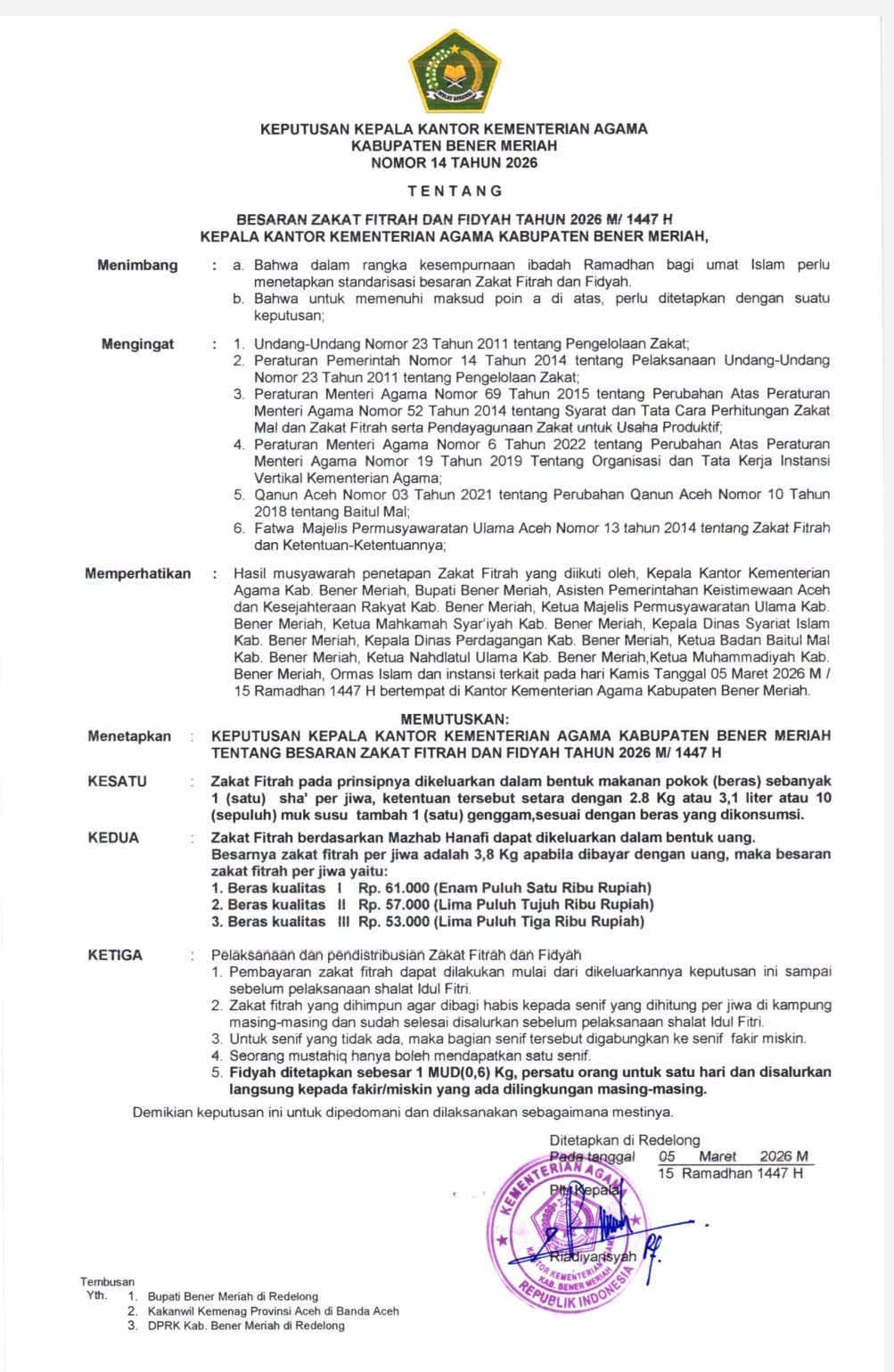 Kantor Kementerian Agama (Kemenag) Kabupaten Bener Meriah resmi menetapkan besaran zakat fitrah dan fidyah untuk tahun 2026 M/1447 H melalui Keputusan Kepala Kantor Kemenag Kabupaten Bener Meriah Nomor 14 Tahun 2026 yang ditetapkan di Redelong pada Kamis, 5 Maret 2026.