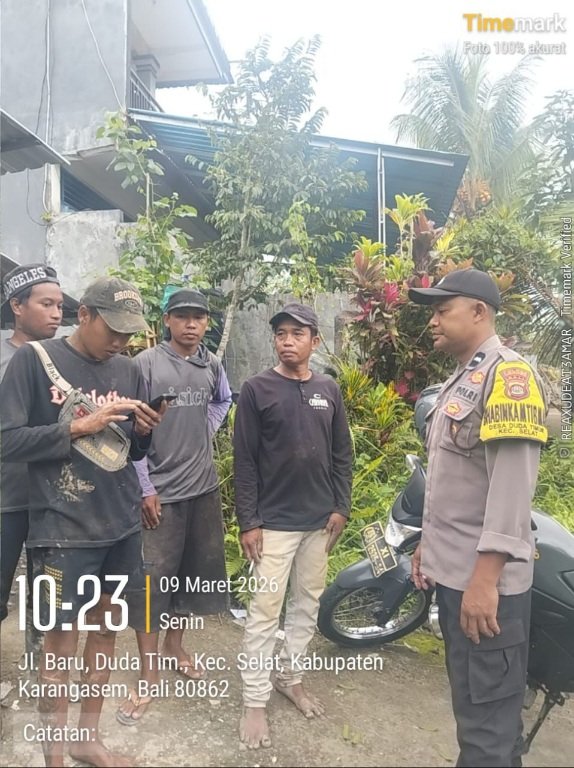 Dalam upaya membangun komunikasi, Bhabinkamtibmas Desa Duda Timur Polsek Selat Aipda I Wayan Suardana, menyambangi warga binaan serta penduduk pendatang yang bekerja sebagai buruh bangunan di Banjar Pesangkan Desa Duda Timur. Pada Senin, 9 Maret 2026.