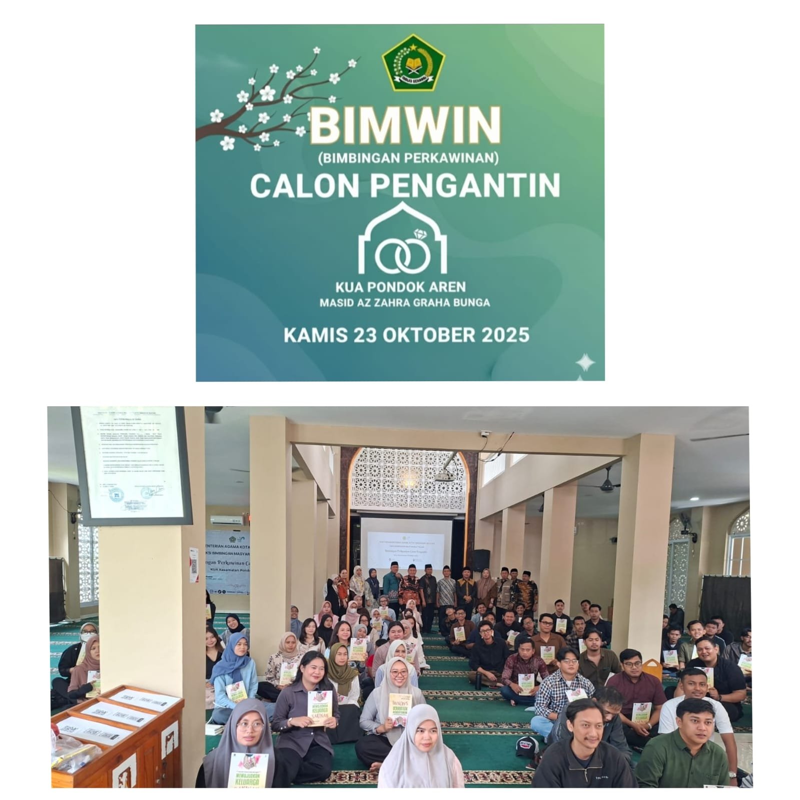 Bimbingan perkawinan (Bimwin)Tahap II Kantor Urusan Agama (KUA) Pondok Aren di Masjid AZ ZAHRA berjalan lancar disambut antusias oleh calon pengantin (Catin) yang dilaksanakan pada 23/10/25 dari jam 07.00-11.30 berjalan dengan khidmat kata sambutan dilakukan oleh H. Ahmad Rifaudin, S.Ag., M.Pd.selaku kepala Kementrian Agama(kemenag)Kota Tangerang Selatan.