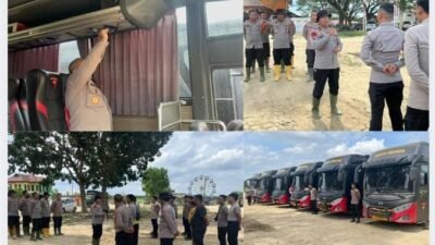 KABUPATEN ACEH TAMIANG – Korps Brigade Mobil (Brimob) Polri melalui Pasukan Brimob I Korbrimob Polri menggelar apel kesiapan kendaraan bus dan truk yang akan digunakan untuk menjemput Anggota Tata Usaha Polri (ANTAP) serta Taruna/Taruni Akademi Kepolisian (Akpol) dari Pelabuhan Belawan Medan ke Batalyon Infanteri 111 Kabupaten Aceh Tamiang pada tanggal 22 Januari 2026. Apel tersebut dilaksanakan pada hari Selasa (20/1/2026) pukul 14.00 WIB hingga selesai di Lapangan Sport Center Kabupaten Aceh Tamiang, dengan personel berpakaian PDL II Coklat Tactical.