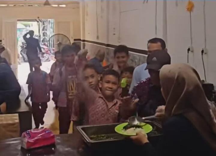 “Saya baru pulang Sekolah langsung kesini Om, makan dulu disini baru pulang ke rumah. Makanannya enak sampe kenyang Saya,” ujar salah seorang bocah SD sambil menyantap sepiring nasi beserta lauknya, Senin (04/11/2024).
