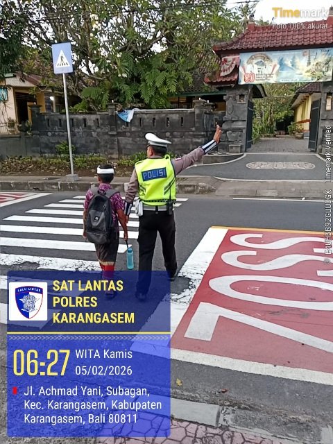 Untuk mengutamakan keselamatan pejalan kaki khususnya kepada para pelajar serta memastikan arus lalulintas lancar dan kondusif, personil satuan lalu lintas melaksanakan pengaturan arus lalulintas untuk menyebrangkan siswa siswi SD Negeri 1 Subagan. Pada Kamis, 5 Februari 2026.