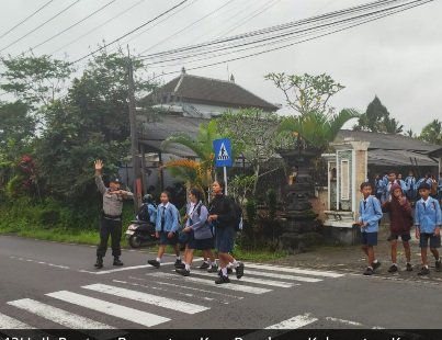 Personil Polsek Rendang melaksanakan pengamanan pengaturan lalu lintas atensi Anak-anak sekolah di SMP 2 Rendang menyeberang jalan raya serta menghimbau untuk berhati-hati dijalan raya agar tercipta situasi yang aman kondusif, pada Senin, (23/2/2026).