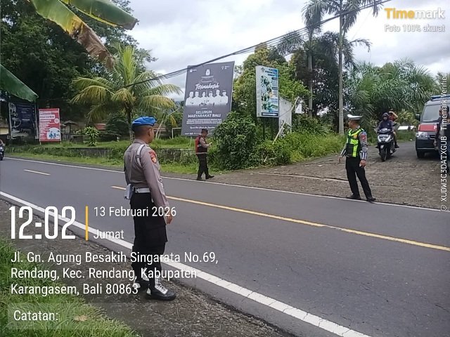 Personel Polsek Rendang Polres Karangasem melaksanakan kegiatan pos keselamatan Strong Point atensi arus lalu lintas, kegiatan ini dilakukan untuk mencegah gangguan keamanan arus lalu lintas dan laka lantas. pada Sabtu, (14/2/2026).