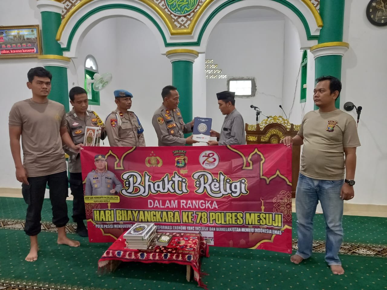 Selain membersihkan tempat ibadah bersama Masyarakat Umat Islam dan Hindu, Jajaran Polsek Tanjung Raya juga memberikan bantuan berupa Al-Qur’an dan buku Iqro kepada Pengurus Masjid Nurul Huda Desa Gedung Ram. Sambung terang IPTU Bambang. Selasa (25/06/24)