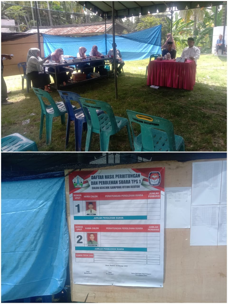 Pemilihan Keuchik Gampong Uteun Reutoh, Kecamatan Kota Juang, Kabupaten Bireuen, yang berlangsung di halaman Meunasah setempat pada Selasa, 29 Oktober 2025, berjalan tertib, lancar, dan demokratis.