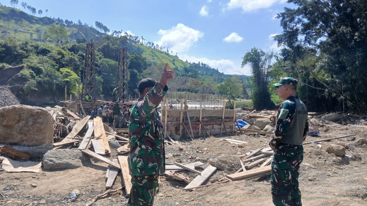 Komandan Distrik Militer (Dandim) 0106/Aceh Tengah, Letkol Inf Raden Herman Sasmita, meninjau langsung proses pengecoran pondasi abutment 2 dan pondasi abutment 1B pada pembangunan jembatan gantung di Desa Burlah, Kecamatan Ketol, Kabupaten Aceh Tengah, Minggu (1 Februari 2026).
