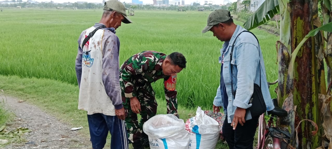 Surabaya |Jatim | Selasa, 4 Februari 2025. Babinsa Koramil 0830-12/Kenjeran, Sertu Budi Hermanto, bersama anggota Kelompok Tani (Poktan) Sumber Rezeki, melaksanakan kegiatan pemupukan padi di area persawahan kompleks AL, Jalan Memet No. 47, Kelurahan Sukolilo Baru, Kecamatan Bulak, Surabaya.