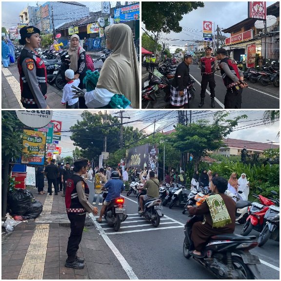 Di tengah khidmatnya ibadah umat Muslim, tampak sinergi kuat antara personel Polda Bali dan pecalang yang bahu-membahu menjaga keamanan dan ketertiban.