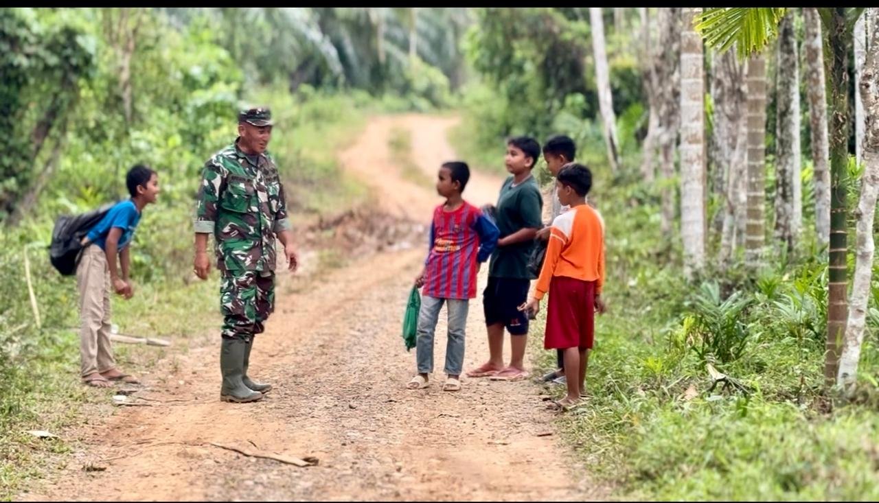 Di sebuah jalan tanah yang membelah kebun, langkah-langkah sederhana itu terasa begitu sangat berarti. Tidak ada upacara, tidak ada barisan resmi, yang ada hanyalah kebersamaan yang mengalir alami antara Prajurit Satgas TMMD ke-127 TA. 2026 Kodim 0111/Bireuen dengan anak-anak Desa Jeumpa Sikureng, tepatnya terletak di Kecamatan Jeunib Kabupaten Bireuen. Sabtu (21/2/2026).
