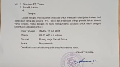 Sukra, Kab. Indramayu – Para pemilik lahan yang terisolir dampak pembangunan PT Tesco Indomaritim merasa kecewa dengan ketidakhadiran nya manajemen ataupun perwakilan (penerima kuasa) dari PT Tesco Indomaritim yang diundang oleh Camat Sukra guna tempuh mediasi terkait polemik lahan warga yang terisolir (Rabu 17 Juli 2024).