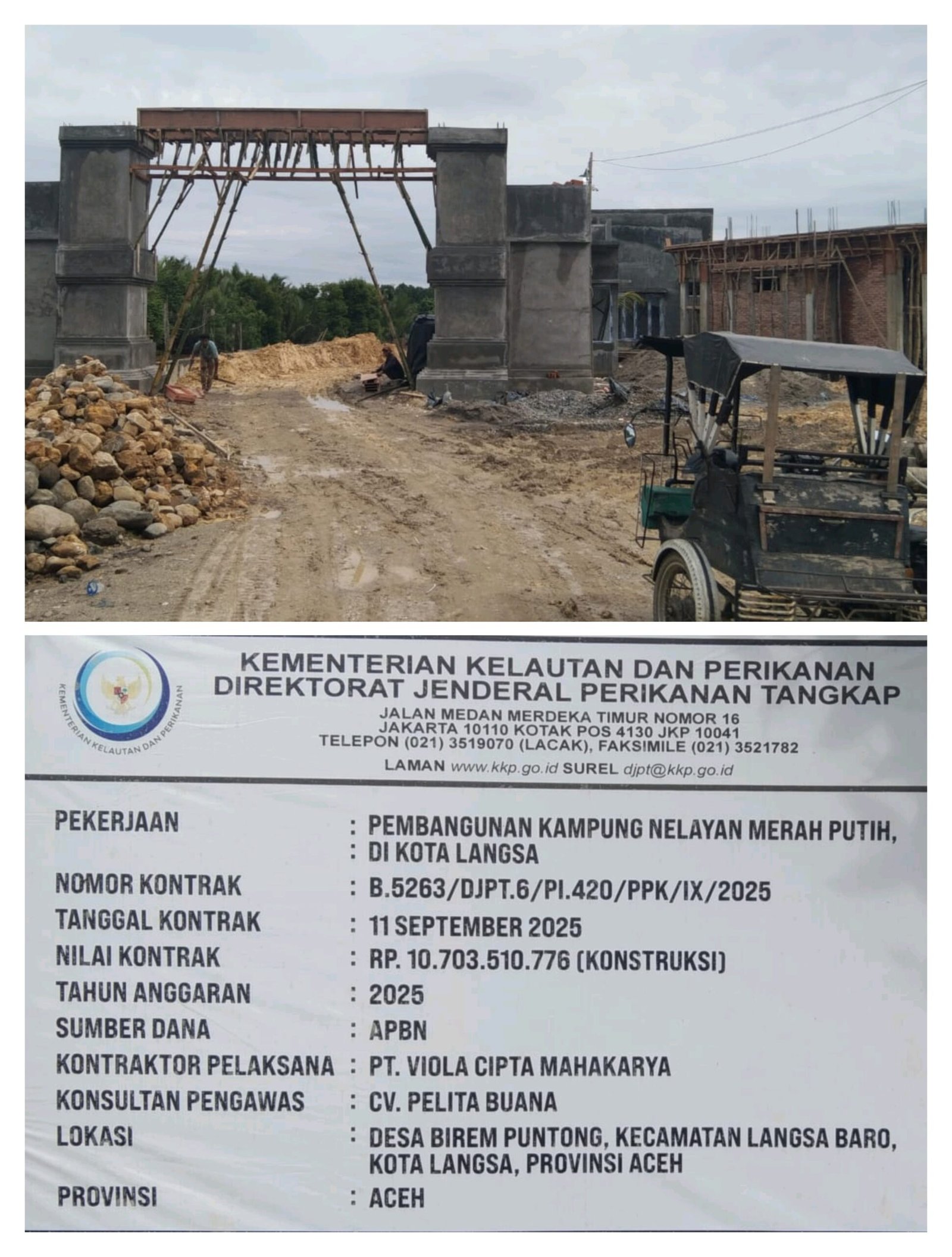 Sesuai hasil pantauan dan juga hasil investigasi secara tergabung, dengan pihak salah satu seorang pengurus lembaga swadaya masyarakat (lsm) bungoeng lam jaroe aceh di kota langsa. Kemarin, pada tanggal 2 januari tahun 2026 lalu. Langsung ke lokasi proyek pembangunan kampung nelayan merah putih tersebut, terlihat dari segi plang papan nama yang terpasang dan juga di tampilkan secara publik. Terkesan menjadi pembodohan terhadap publik, yang tertulis dalam plang papan nama itu.