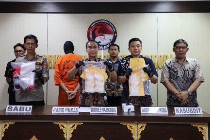 Kombes Pol Radiant menyampaikan dari tangan tersangka kita juga mendapatkan barang bukti 978,08 gram netto (kode a1 s/d a2 dan b1 s/d b10) dan 1 (satu) plastik klip bening berisi 2 butir tablet berwarna hijau bergambar mahkota yang diduga mengandung sediaan narkotika golongan 1 jenis ekstasi dengan berat 0,90 gram netto (kode c). Termasuk timbangan, HP serta peralatan pendukung lainnya dalam mengedarkan barang haram tersebut.
