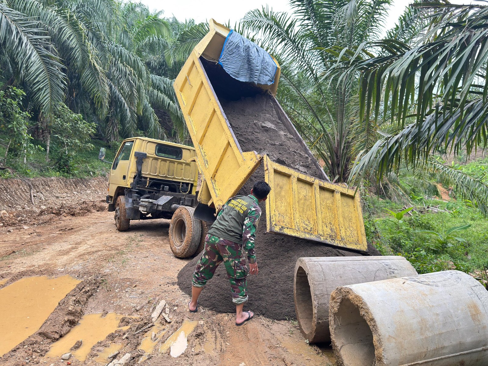 Dengan penuh semangat gotong royong, personel Satgas TMMD bersama masyarakat bahu-membahu menurunkan pasir dari kendaraan pengangkut ke titik penumpukan yang telah disiapkan. Kebersamaan antara TNI dan warga terlihat begitu harmonis, mencerminkan kemanunggalan TNI dengan rakyat yang menjadi roh utama program TMMD.