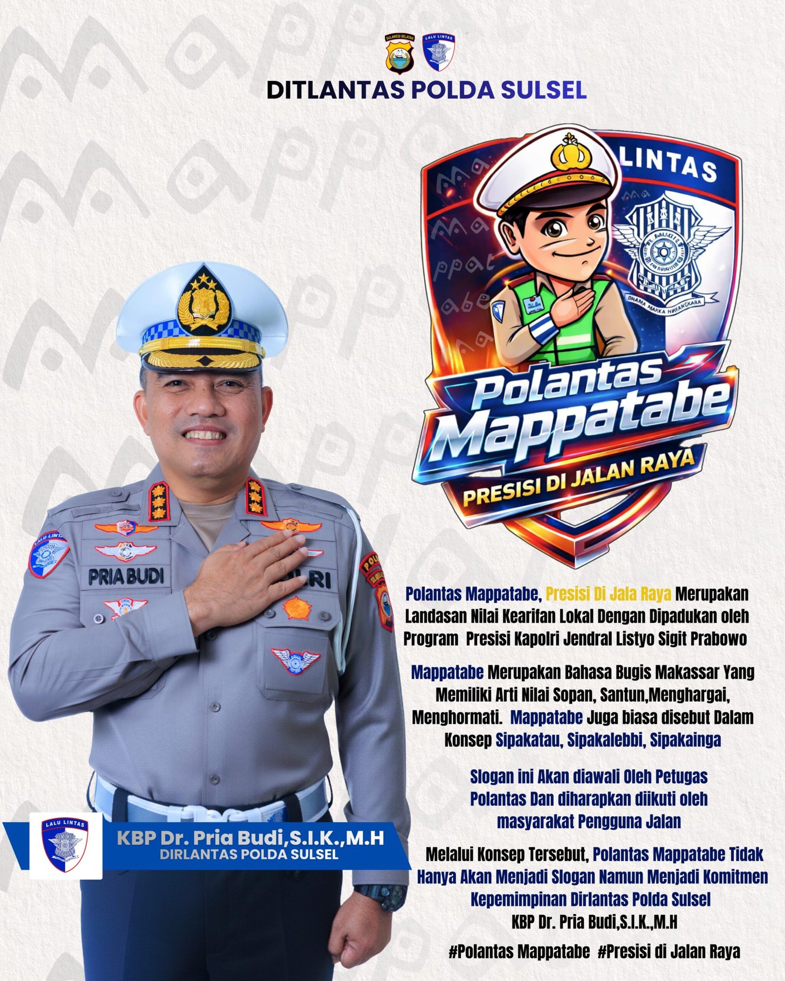 “Mappatabe merupakan nilai luhur dalam budaya Bugis Makassar yang bermakna sopan, santun, dan saling menghormati. Nilai ini akan kami padukan dengan semangat Presisi agar pelayanan lalu lintas semakin humanis dan profesional,” ujar Pria Budi, Kamis (29/01/2026).