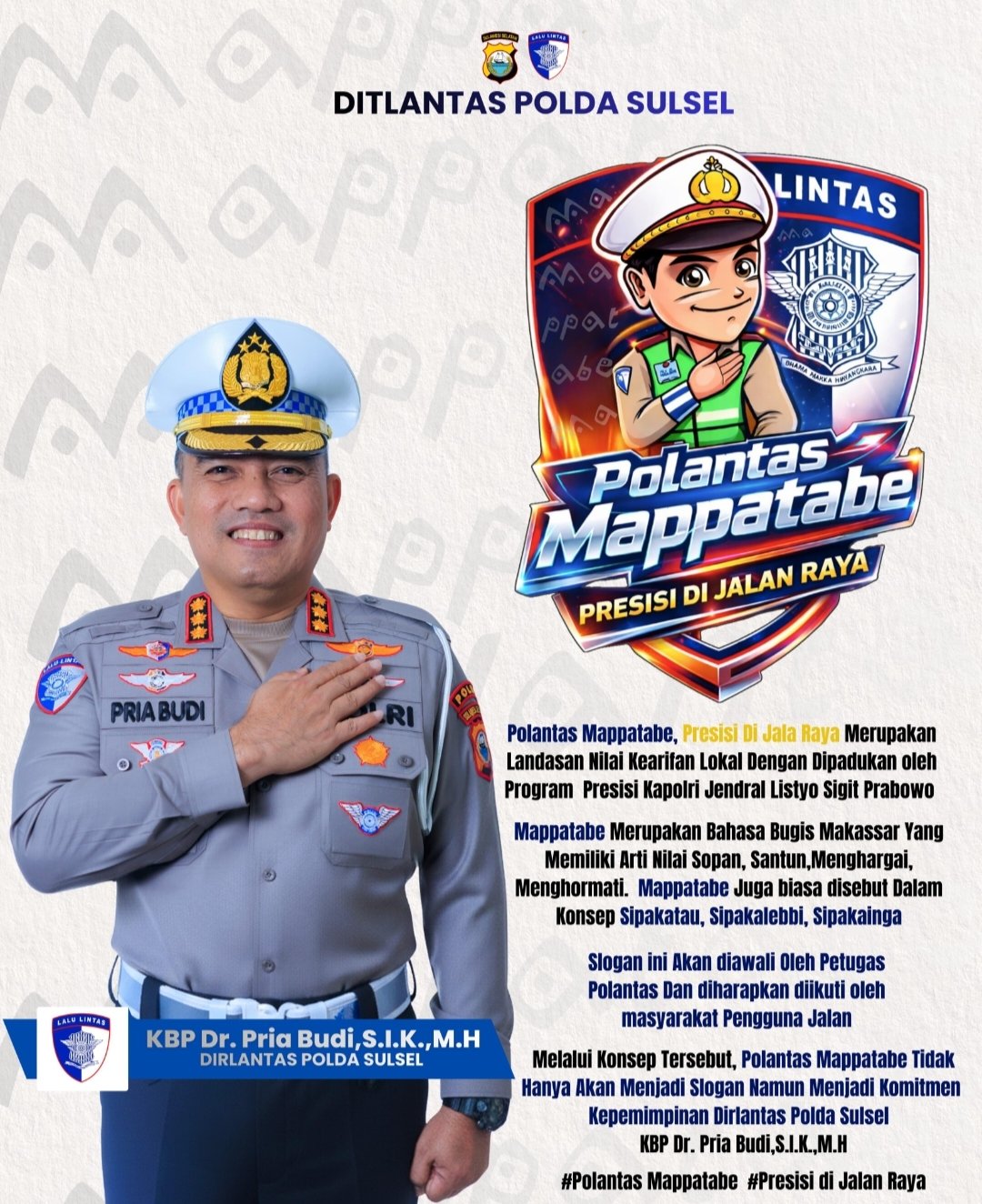 Dirlantas Polda Sulsel KBP Dr. Pria Budi, S.I.K., M.H. menegaskan, konsep Mappatabe bukan sekadar jargon, melainkan filosofi budaya yang akan dijadikan pedoman sikap dan perilaku setiap personel Polantas dalam menjalankan tugas di lapangan.