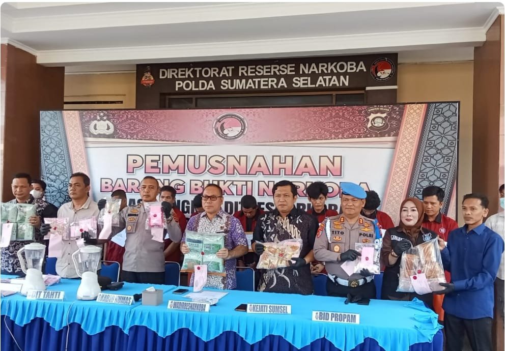 Direktorat Reserse Narkoba (Ditresnarkoba) Kepolisian Daerah (Polda) Sumatera Selatan memusnahkan barang bukti narkotika dalam jumlah besar hasil ungkap kasus bulan November 2025. Pemusnahan dilakukan dengan cara memblender barang haram tersebut di Mapolda Sumsel, Jumat (21/11/2025).