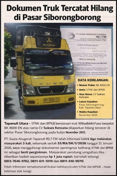 Dokumen kendaraan bermotor berupa Surat Tanda Nomor Kendaraan (STNK) dan Buku Pemilik Kendaraan Bermotor (BPKB) dengan nomor polisi BK 8608 EN atas nama CV Sukses Kencana dilaporkan terjatuh di sekitar Pasar Siborongborong, Kabupaten Tapanuli Utara.