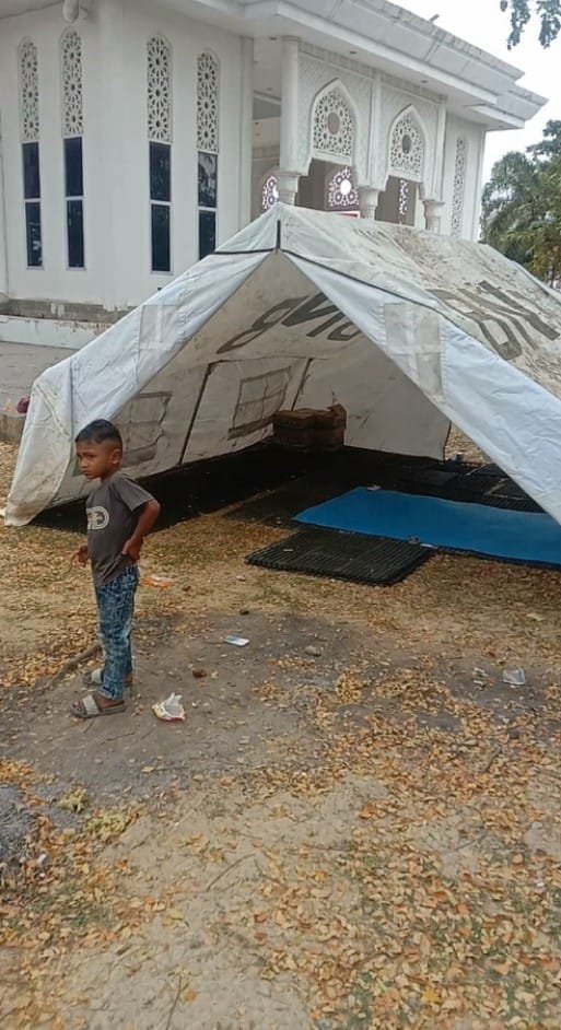 Meski sebagian warga telah kembali, masih terdapat beberapa tenda dari desa lain yang tetap bertahan di area sekitar Kantor Bupati Bireuen.