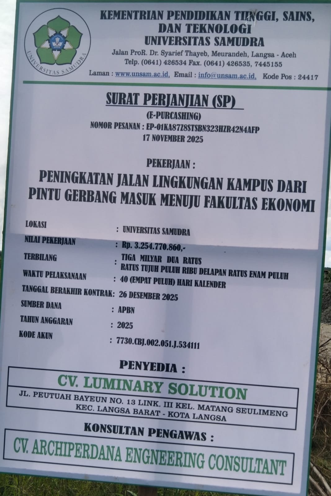 Sesuai pula, pada sebelumnya. Sempat terlihat dari segi plang papan nama nilai dana anggaran kerja, yang tertuliskan. Kementerian pendidikan tinggi, sains. Dan teknologi, universitas samudra. Yang beralamat, jalan prof dr syarief thayeb meurandeh-langsa-aceh. Surat perjanjian (sp), e-purcashing. Nomor pesanan, EP-01KA8778STSBN323HZR42N4AFP 17 november 2025. Pekerjaan, peningkatan jalan lingkungan kampus dari pintu gerbang masuk menuju fakultas ekonomi. Lokasi, universitas samudra. Nilai pekerjaan, Rp.3.254.770.860.- terbilang, tiga milyar dua ratus ratus tujuh puluh ribu delapan ratus enam puluh. Waktu pelaksanaan, 40 (empat puluh) hari kalender. Tanggal berakhir kontrak, 26 desember 2025. Sumber dana, APBN. Tahun anggaran, 2025. Kode akun. 7730, CBJ. 002, 051. J, 534111. Penyedia, cv luminary solution. Konsultan pengawas, cv archi perdana engneering consultant.
