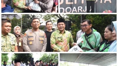 KOMINFO,Sidoarjo– 1.000 paket Sembako dibagikan dalam Bakti Sosial/Baksos yang digelar Yayasan Mawar Sharon Peduli (MSP) bersama Forkopimda Sidoarjo, Kamis, (11/12). Selain Sembako, 1.000 porsi makan gratis juga disediakan dalam Baksos yang digelar di Perumahan Argent Park Kelurahan Sidoklumpuk Sidoarjo tersebut. Selain masyarakat sekitar, pengemudi Ojek Online/Ojol juga ikut menerima Sembako itu.