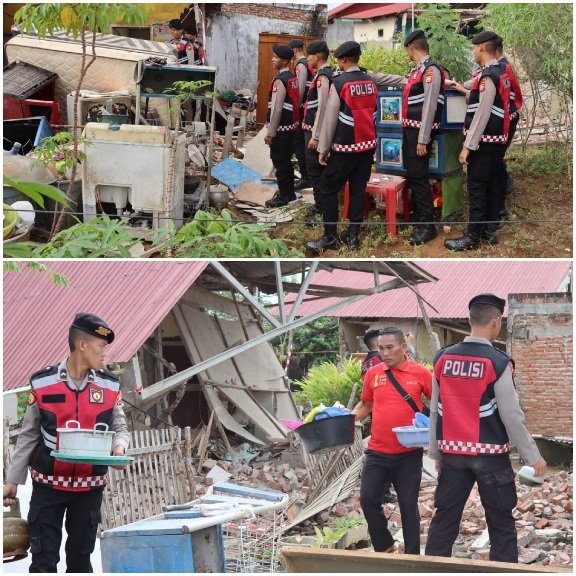 Menanggapi kondisi tersebut, Polri melalui Dit Samapta Polda Bengkulu bergerak cepat memberikan bantuan kemanusiaan dengan mengerahkan personel untuk membantu proses pembersihan material bangunan yang runtuh.