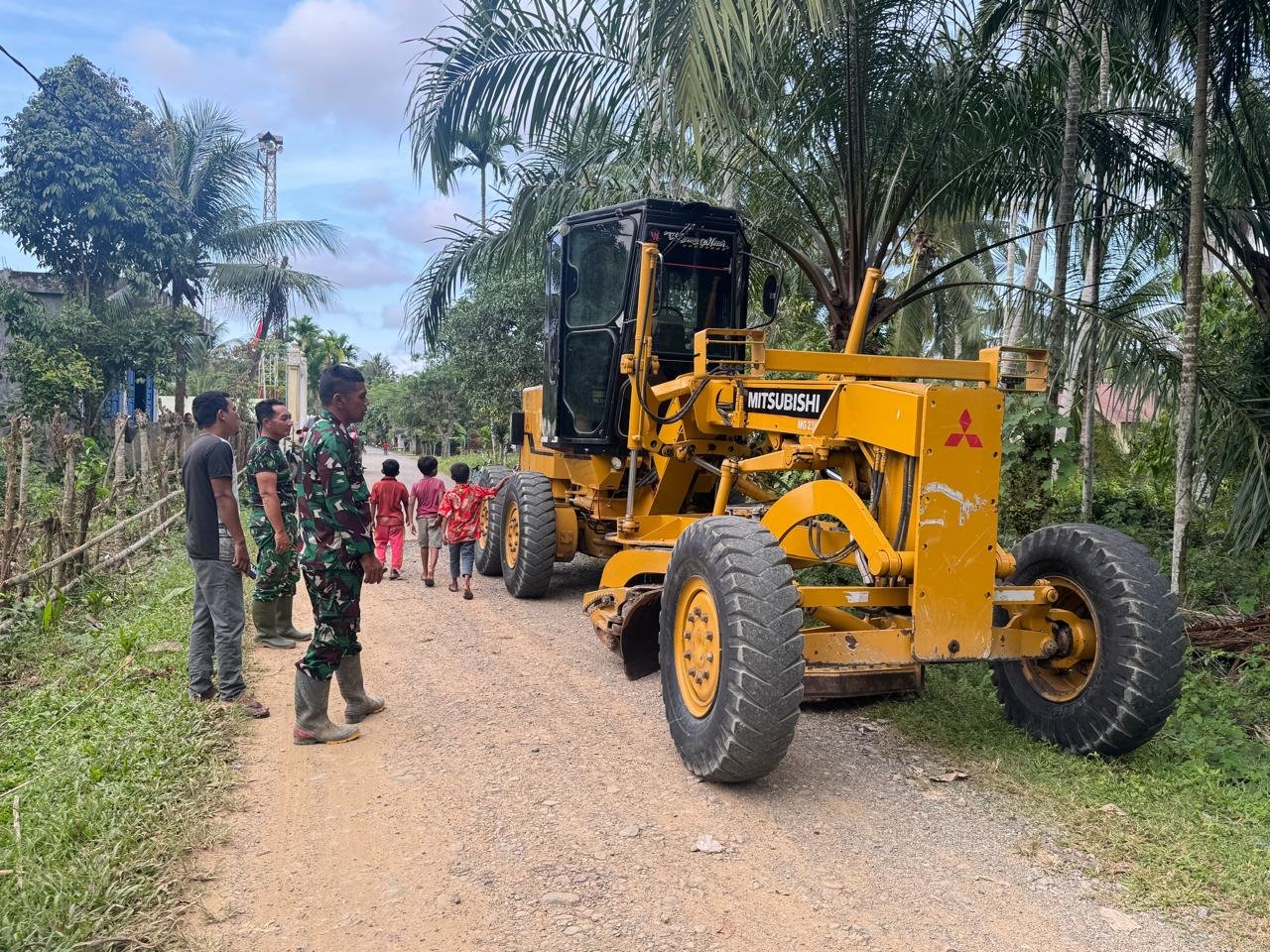 Kehadiran alat berat tersebut juga menarik perhatian warga sekitar, termasuk anak-anak yang antusias menyaksikan proses pengerjaan jalan. Hal ini menjadi gambaran nyata kedekatan TNI dengan masyarakat dalam setiap kegiatan TMMD.