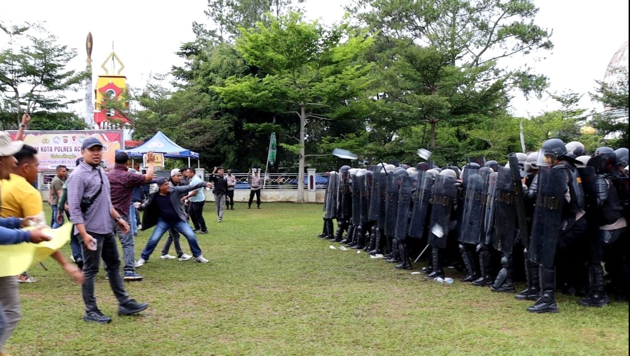 Emosi massa semakin meningkat dan melakukan pelemparan hingga pendorongan, Kompi Dalmas Samapta Polres Aceh Tengah lanjut maju mendorong massa dengan formasi sesuai perkap 16 tahun 2006 tentang pedoman dalmas.