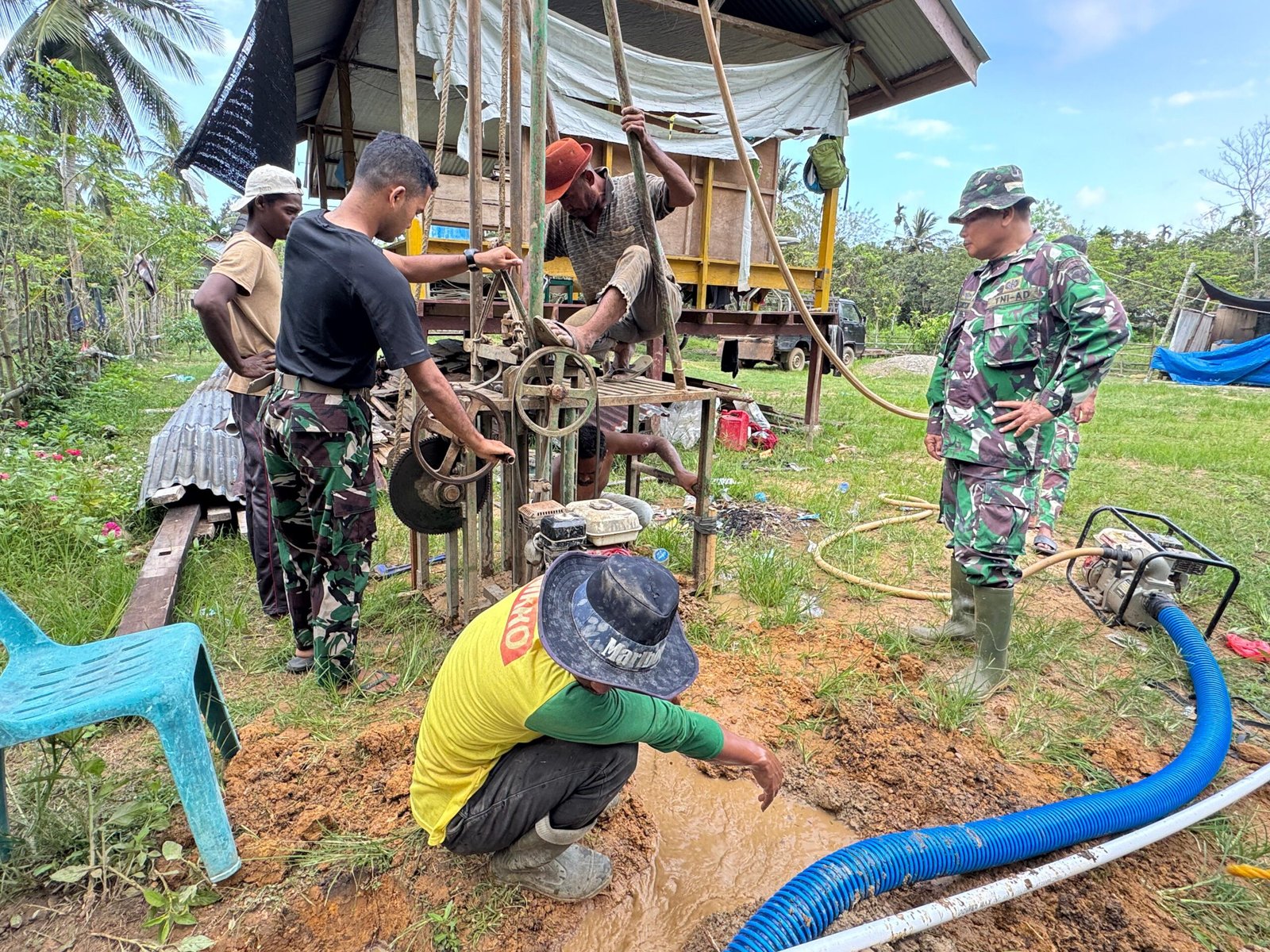 Personel Satgas TMMD bersama masyarakat setempat terlihat bahu-membahu dalam proses pengerjaan, mulai dari pengeboran, pemasangan instalasi, hingga penyiapan sarana pendukung.