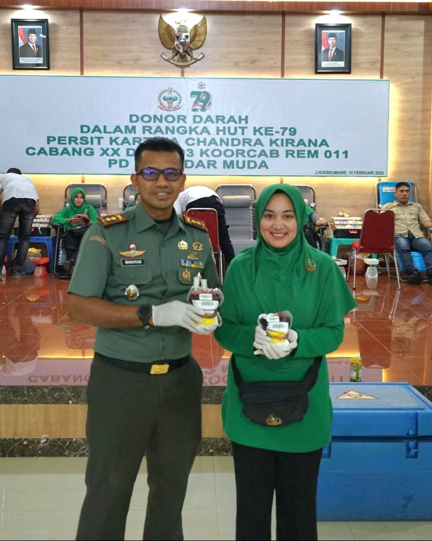 Dalam rangka memperingati Hari Ulang Tahun Persit Kartika Candara Kirana Dandim 0103/Aceh Utara Letkol Kav Makhyar, S.T., M.M., M.H.I., di dampingi Ketua Persit KCK Cab XX Dim 0103 Koorcab Rem 011 PD Iskandar Muda Ny. Raena Maidelsa Makhyar menggelar donor darah yang dilaksanakan di Aula Sapta Marga Gampong Jawa Lama, Kecamatan Banda Sakti, Kota Lhokseumawe, Senin (10/2/2025).