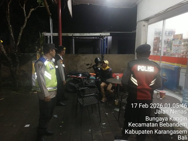 Di bawah guyuran hujan gerimis, cahaya biru rotator Kepolisian tetap konsisten menyisir jalur-jalur rawan di wilayah hukum Polsek Bebandem. Jajaran Polsek Bebandem melaksanakan Blue Light Patrol guna mengantisipasi gangguan Kamtibmas di tengah malam, Selasa (17/02/2026) dini hari.