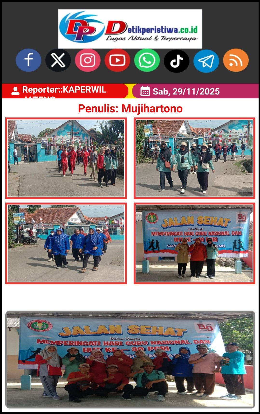 Dirinya mengatakan ” pada hari ini Sabtu 29 November 2025 kami dari Kepala Sekolah ( Kepsek ) guru, dan penjaga SD di Sarwas 5 mengadakan Jalan Sehat Peringati Hari Guru Nasional dan Hari Ulang Tahun ( HUT ) ke 80 Tahun PGRI ” kata Waryoso